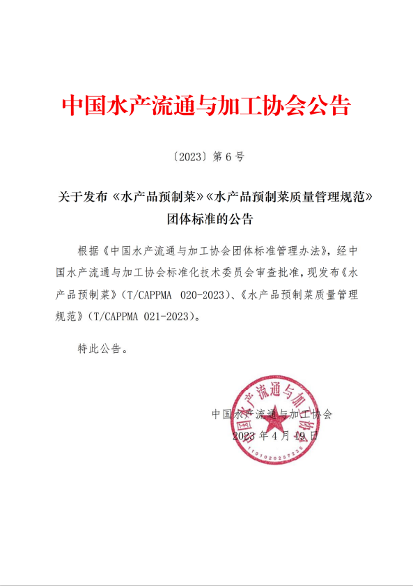 关于发布《水产品预制菜》《水产品预制菜质量管理规范》团体标准的公告