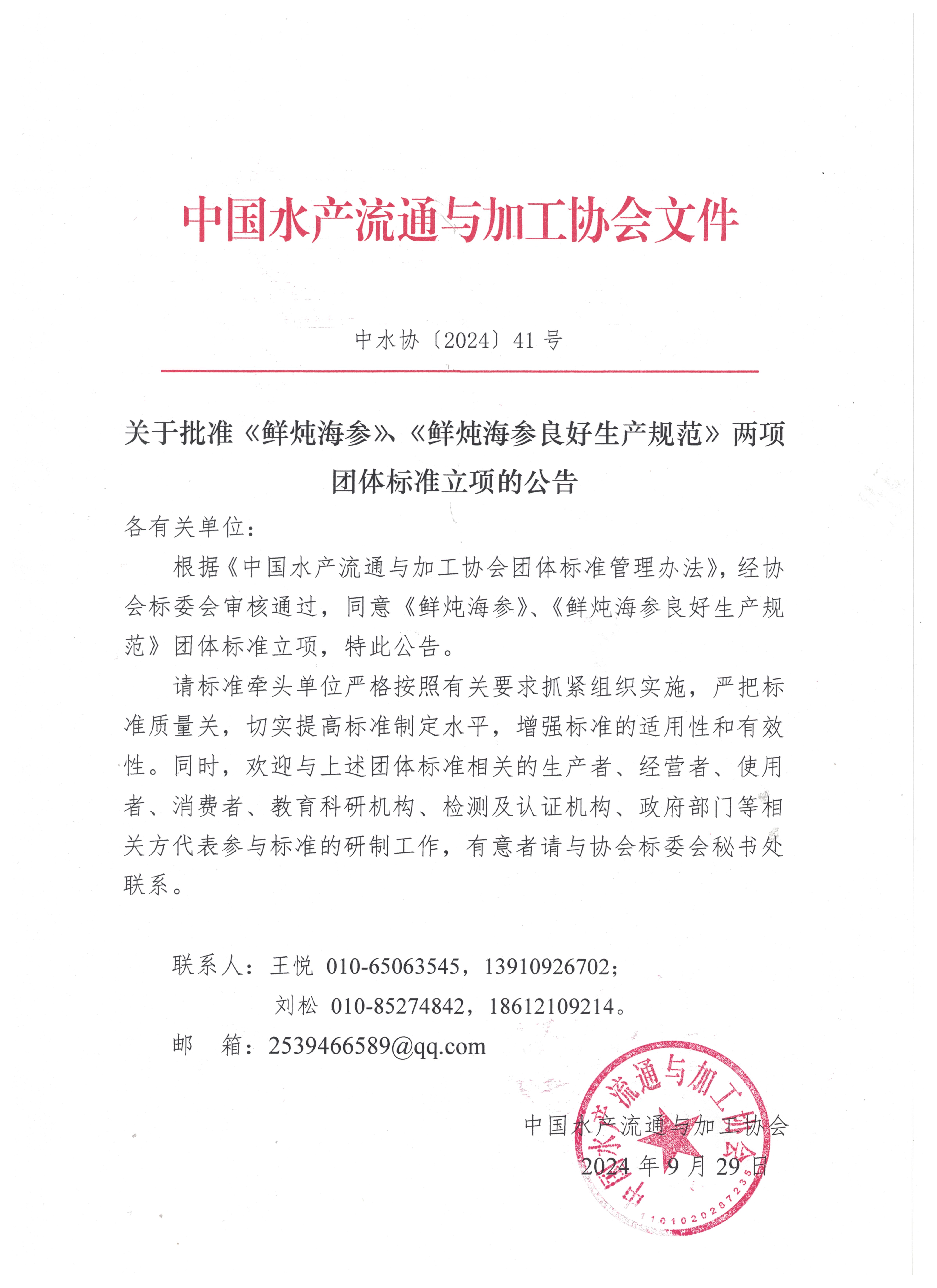 关于批准《鲜炖海参》、《鲜炖海参良好生产规范》两项团体标准立项的公告