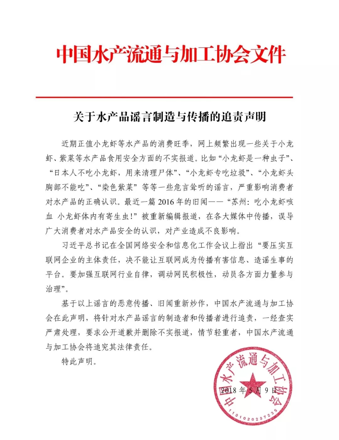 关于水产品谣言制造与传播的追责声明