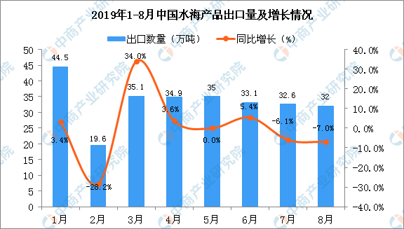 2019年8月中国水海产品出口量为32万吨 同比下降7%