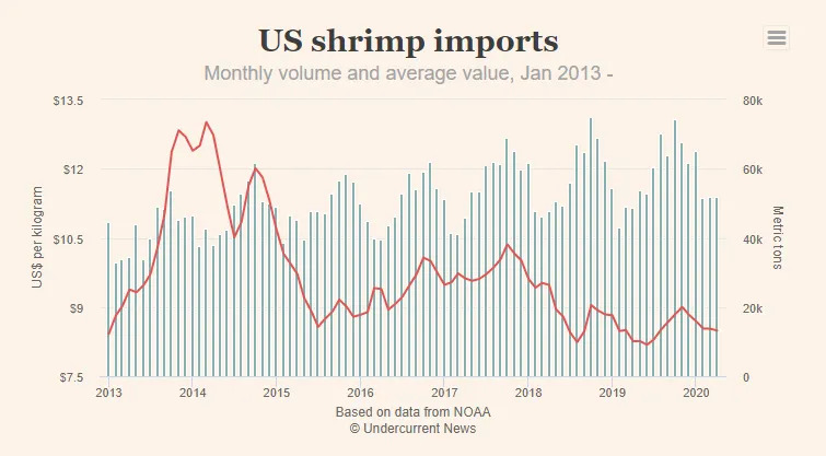 美国虾类进口量不减反增,中国出口继续下行!