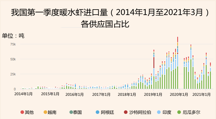 2021年第一季度我国冷冻暖水虾进口量下降13%至13.5万吨