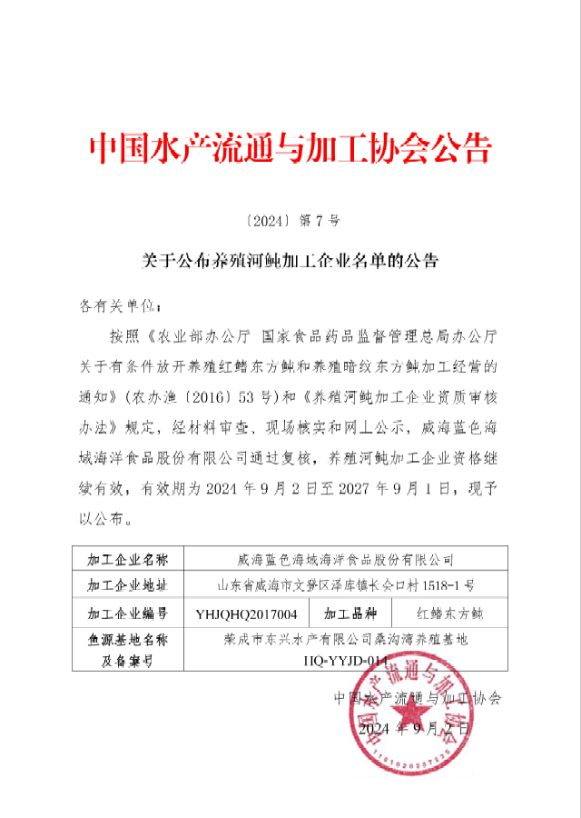 关于公布养殖河鲀加工企业名单的公告(蓝色海域)