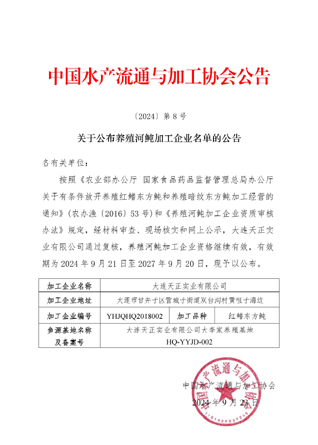 关于公布养殖河鲀加工企业名单的公告(大连天正)