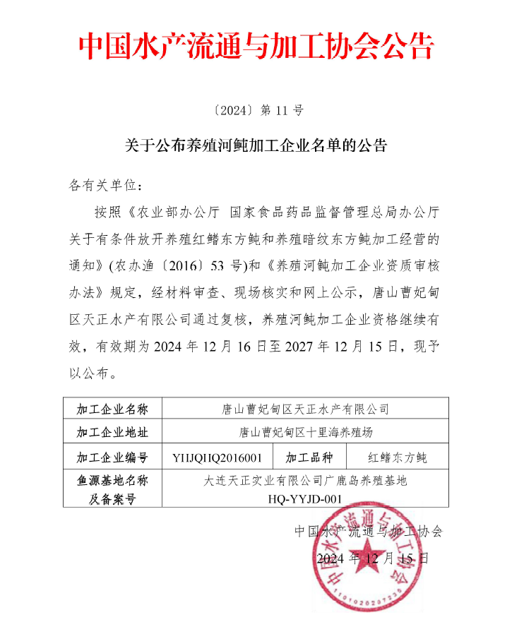 关于公布养殖河鲀加工企业名单的公告(唐山天正)