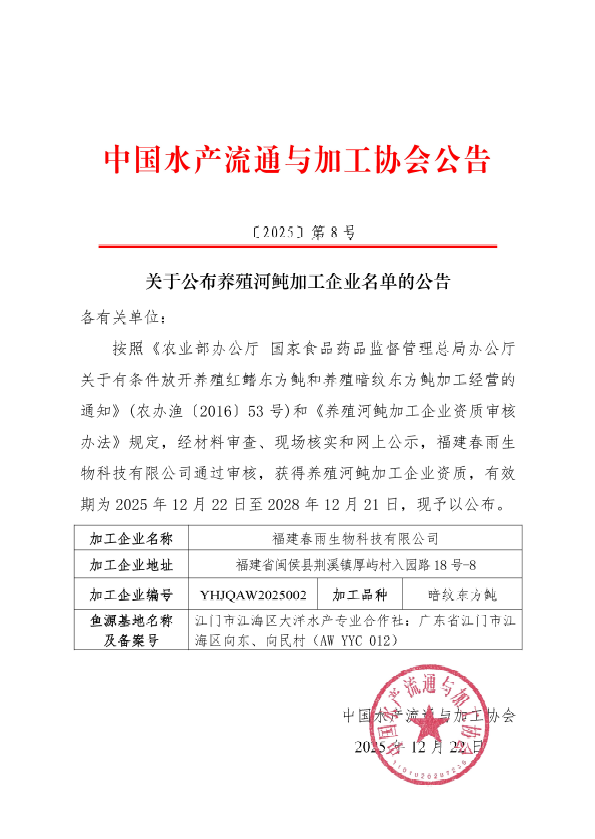 关于公布养殖河鲀加工企业名单的公告(福建春雨)