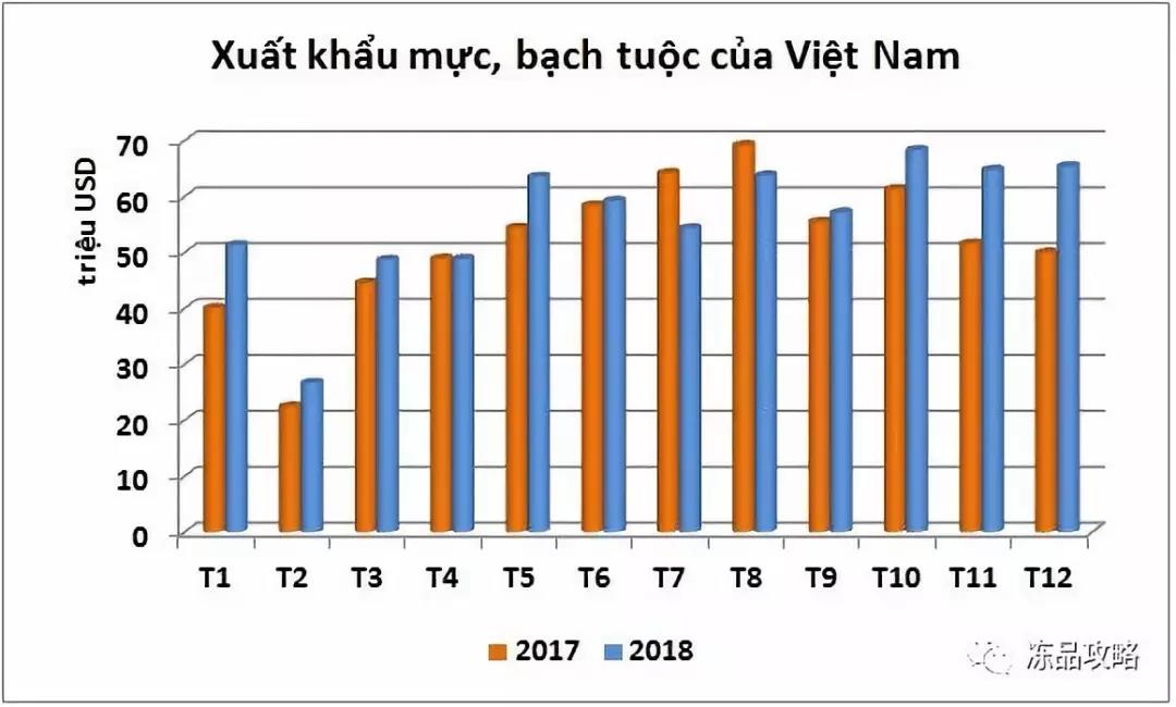 2018年越南出口鱿鱼和章鱼的总价值除了仅在7月和8月下降,其余月份为正增长。尤其是最后一个季度趋于强劲增长。