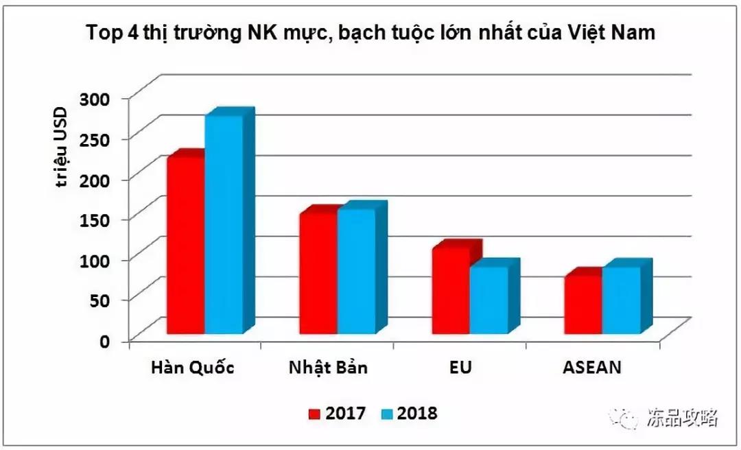 韩国是越南最大的鱿鱼和章鱼进口国,占越南鱿鱼和章鱼出口总量的40%。2018年,章鱼和鱿鱼对该市场的出口增长了23.7%,达到2.698亿美元。