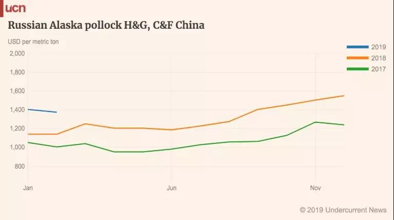 “25公分以上的俄罗斯狭鳕原料价格已从去年12月份的$1,550/吨跌至当前的$1,370/吨。”他说。不过,这并不意味着市场就此衰退,因为每年年初狭鳕价格均会出现小幅下跌。