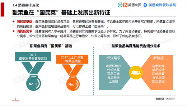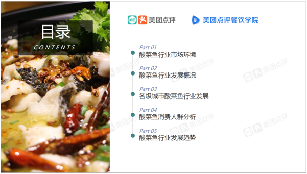 美团点评餐饮学院首次发布《2018中国酸菜鱼发展报告》,报告中概述了酸菜鱼行业市场环境、酸菜鱼的行业发展概况 、各级城市酸菜鱼行业发展 、重点消费人群画像分析以及酸菜鱼行业发展新趋势 。