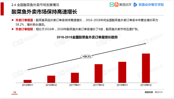 从报告中可以看出,自2016年起酸菜鱼菜品外卖订单量保持高速增长,2016-2018年间全国酸菜鱼外卖订单量半年复合增长率为58.2%,增长势头强劲。 外卖订单规模也相比于2016年,2018年酸菜鱼外卖订单量增长4倍,酸菜鱼外卖市场迅速扩张。