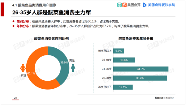 报告中表示,26-35岁人群是酸菜鱼消费主力军。在酸菜鱼消费人群中,女性消费者占比为60.1%,占比高于男性。2018年全国酸菜鱼门店人均消费价格在60元及以下的占比为84%,30元及以下是最主要的消费区间。