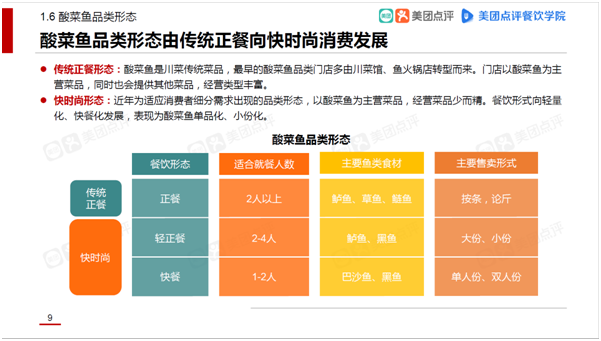 酸菜鱼品类形态由传统正餐向快时尚消费发展。为适应消费者细分需求出现的品类形态,以酸菜鱼为主营菜品,经营菜品少而精。餐饮形式向轻量化、快餐化发展,表现为酸菜鱼单品化、小份化。