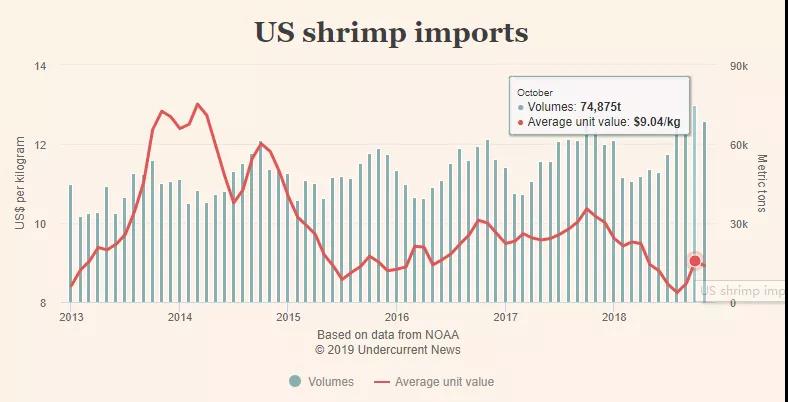 中国市场需求的旺季是春节,美国是圣诞节。据美国国家海洋大气管理局(NOAA)数据,美国虾类产品仅去年十月份的进口量超7万吨,达到74,875吨;十一月份(NOAA最新更新)进口68,671吨。