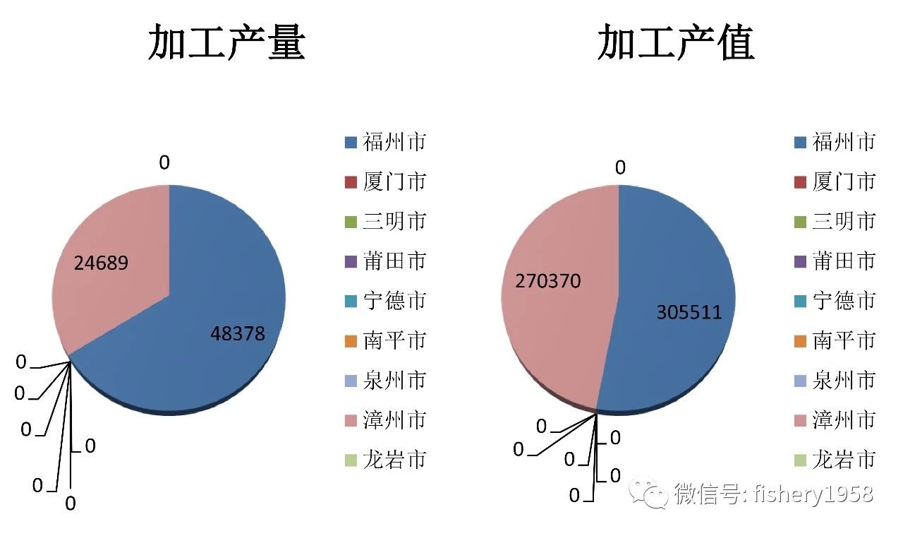 图5 2016年福建省各地区对虾水产品加工产量(吨)和产值(万元)