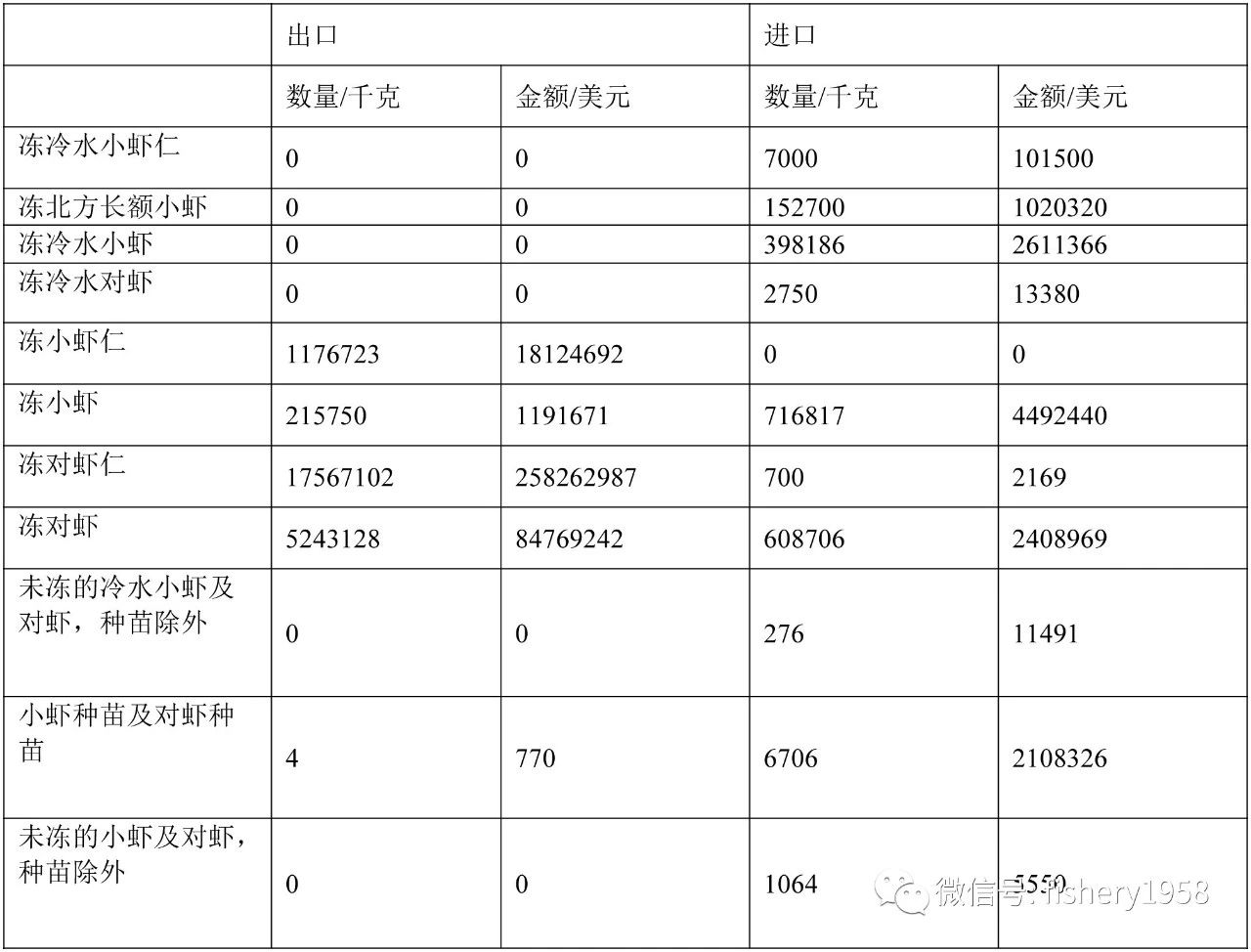 表5 2016年福建省对虾相关水海产品进、出口情况