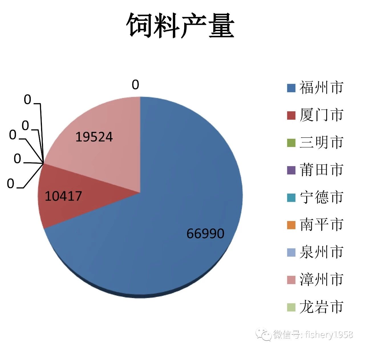 2016年对虾水产品加工产量73067吨,产值575881万元,对虾加工集中在福州、漳州两市(图5)。福建省进出口的水海产品中涉及对虾的主要包括冻冷水小虾仁、冻对虾仁、小虾种苗等(表5),出口数量共计24202.707吨,出口金额36234.9362万元,进口数量共计1894.905吨,进口金额1277.5511万元。此外,2016年福建省饲料企业生产对虾饲料96931吨,占所有饲料产量的13.51%,各地区对虾饲料产量分布见图6,饲料企业集中在福州、漳州、厦门三市,其中福州占福建省饲料产量一半以上。