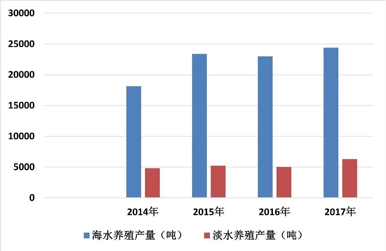 我国河鲀分布于近海及江河下游,河鲀的年捕捞产量约为6万吨~8万吨。养殖河鲀分布在广东、山东、辽宁、江苏、河北和福建等省份,品种以海水红鳍东方鲀和淡水暗纹东方鲀为主(图1)。据2018年中国渔业统计年鉴统计,2017年全国河鲀养殖总产量是3万多吨,其中海水养殖河鲀产量2.4万多吨、淡水养殖河鲀总量0.6万多吨。自2014年起河鲀养殖产量逐年增加(图2)。