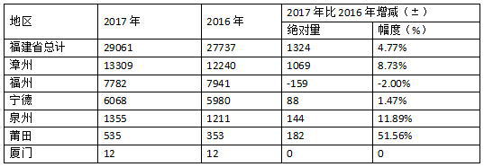 2017年我国石斑鱼年养殖产量13.1536万吨。其中福建省石斑鱼养殖产量2.9061万吨,占全国22.10%,居全国第三,较2016年的27737吨,增幅为4.8%(图2)。据统计,2017年,福建省有石斑鱼养殖产量报告的市6个,依次为漳州市、福州市、宁德市、泉州市、莆田市、厦门市(表2、图3)。