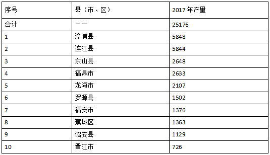 2017年福建省石斑鱼养殖产量前10名的县(市、区)中,漳州市4个(漳浦县、东山县、龙海市、诏安市)、福州市2个(连江县、罗源县)、宁德市3个(福鼎市、福安市、蕉城区)、泉州市1个(晋江市)。10个县(市、区)的石斑鱼养殖总产量为25176吨,占福建省石斑鱼养殖总产量的86.63%。其中,福建省共有2个县(市、区)石斑鱼产量超过5000吨,漳州市漳浦县和福州市连江县,石斑鱼产量分别为5848和5844吨(表3)。