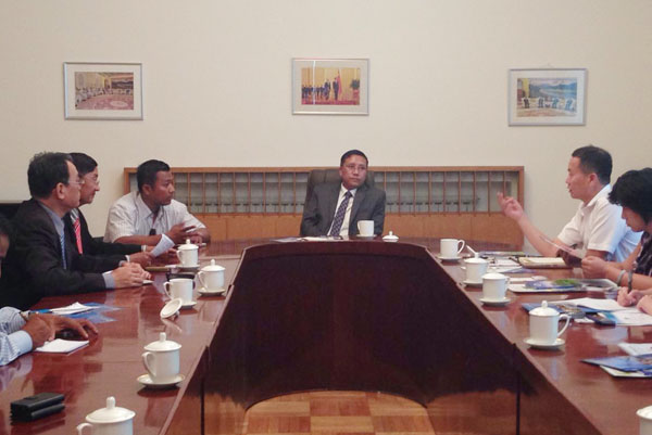 首先缅甸驻华大使Thit Linn Ohn先生简要介绍了缅甸渔业情况,并希望通过我会联合更多力量,加深合作。崔和会长简要介绍了我会的情况、在国际水产品贸易中地位、协会会员组成等方面内容,提出了具体合作途径(贸易或投资),并介绍了我会即将开展的重要活动,2014年9月17日将在广西南宁召开“海上丝绸之路国际渔业合作论坛”,2015年5月份将在厦门召开“2015年亚太地区水产养殖大会”,欢迎缅方派员参加。缅方代表对上述活动特别针对水产养殖的专业展览表示了浓厚的兴趣。