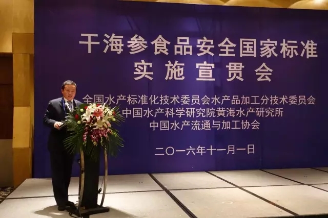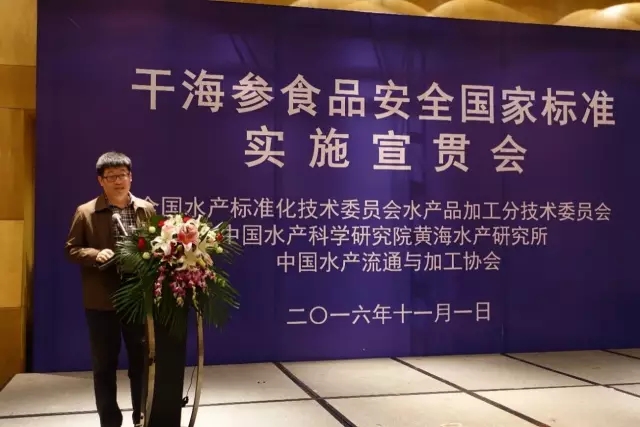 全国水产标准化技术委员会秘书长房金岑研究员致辞,他表示该标准的出台意义非凡,将产品标准制定成强制性食品安全国家标准在业内并不多见,可见国家对海参产业的重视,并希望与会代表借此机会就标准实施中可能遇到的问题及时与起草人员反馈交流,以达到预期的宣贯效果。
