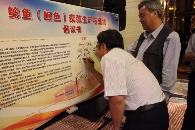 ◇与会代表在《鲶鱼(鮰鱼)规范生产与经营的倡议书》上签名