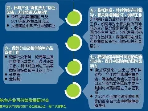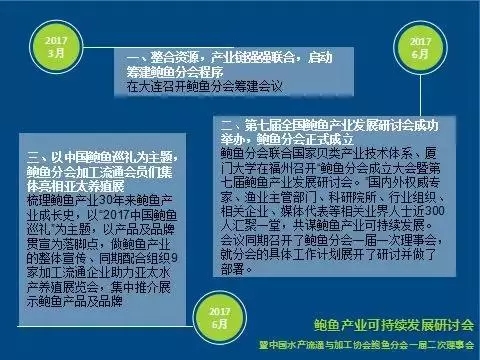 2018年2月2日,鲍鱼产业可持续发展研讨会在福建省连江县召开,本次会议主题围绕环保政策、产业经济等重大问题,深入探讨“产学研”融合发展思路,探索新形势下鲍鱼产业的机遇与挑战。会议同期召开中国水产流通与加工协会鲍鱼分会一届二次理事会,针对鲍鱼团体标准立项及协会作用等重要事务展开探讨,讨论“鲜活、冷冻鲍鱼”等团体标准制定方案,通过规范行业标准,达到加强鲍鱼产品加工监管,加强行业自律,促进品牌建设,提升国内鲜活鲍鱼、冷冻鲍鱼产品的质量和知名度的目的。