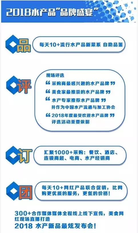 2016最具影响力水产品企业品牌,2017最最具影响力水产品企业品牌,2016最具影响力水产品区域公用品牌,国家驰名商标,地标产品,优势区域品牌,特色之乡,省部级、市级著名品牌、知名品牌,政府主管部门推荐品牌产品,通过BAP、ASC、MSC、GAP、绿色及有机等认证的品牌产品及优质展商产品。