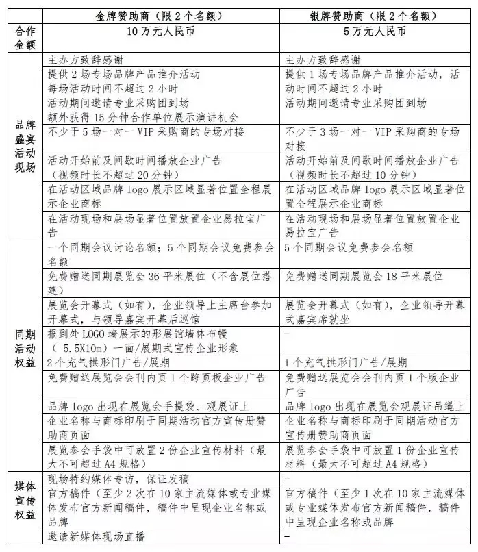 每个品牌展示格(含实物展示、纸质宣传材料摆放,10分钟宣传片播放,一个易拉宝摆放)收取2万元成本费,协会会员1.5万元。另外,根据参与专场烹饪展示、专场采购对接会、专场宣讲推介会等不同环节及合作服务要求不同定制5-10万的赞助方案,详情请进一步接洽。