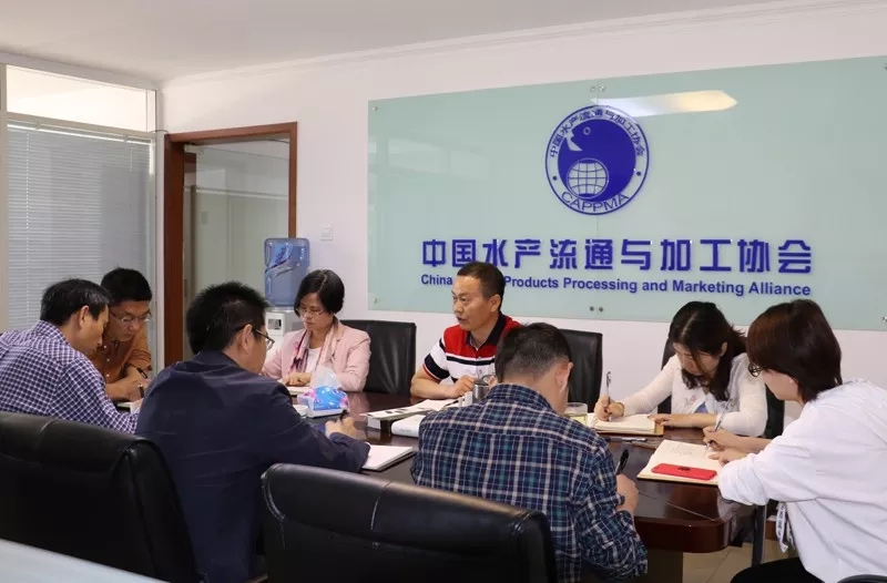 2018年5月3日上午,农业农村部渔业政管理局部局副巡视员江开勇、渔情监测与市场加工处处长徐乐俊一行莅临我会调研。我会崔和会长、陈丽纯副秘书长、朱亚平副秘书长以及项目部、国合部、质管部和会展部的负责人,就中国水产品加工业和水产品贸易市场发展情况,水产品国内外品牌与认证等进行了汇报与交流。