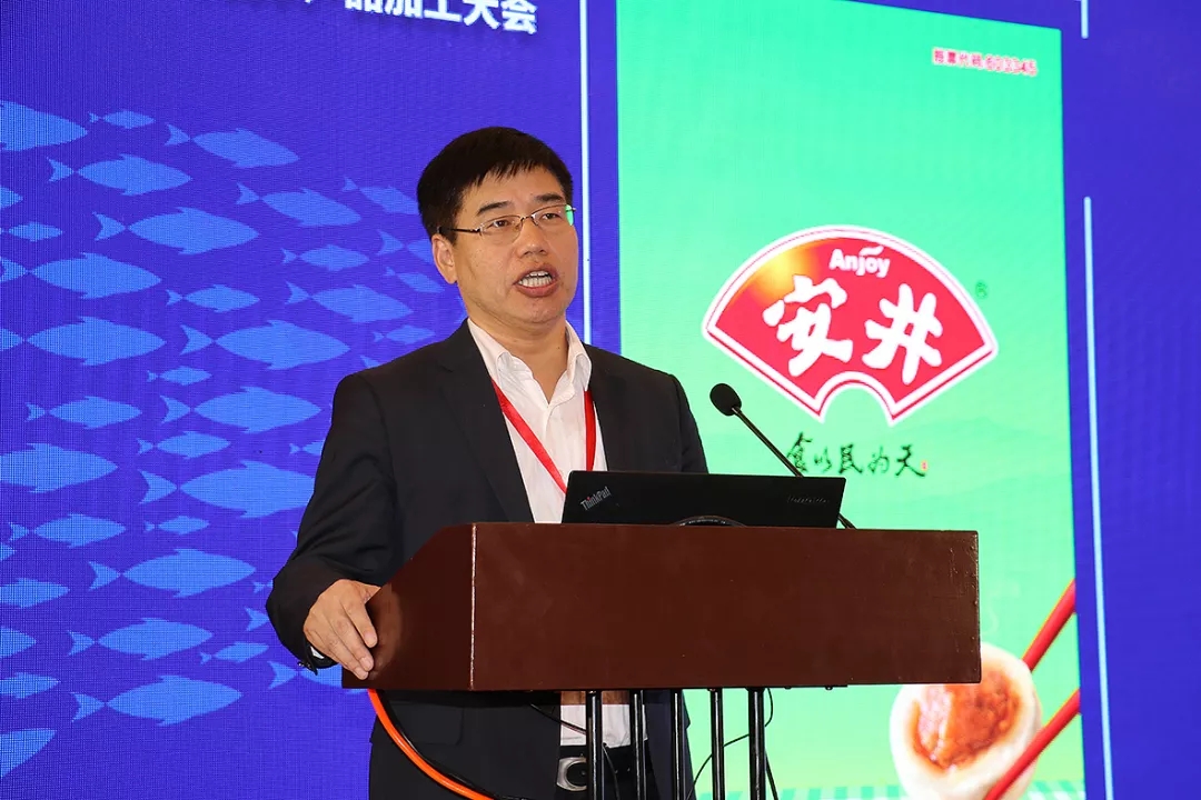 下午召开加工大会主论坛。中国海洋大学食品科学与工程学院薛长湖教授,阐述了《海洋水产品加工发展趋势与展望》。薛教授强调未来水产加工业绿色发展和技术创新是两大趋势。其中,产业绿色发展目标是“健康、循环、高效、低耗”,这就要求水产品加工要实现安全化、高质化、生物化、功能化。技术发展趋势中,薛教授全面介绍了鲜活水产品绿色冷链物流与品质保持技术、水产品超高压物理保鲜技术、水产品高级干燥等技术创新领域与方向。