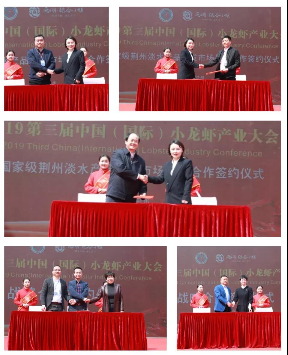 会议期间举行了合作签约仪式:中国邮政储蓄银行股份有限公司湖北省分行与湖北虾稻产业协会,苏宁易购集团股份有限公司、荆州礼小龙生态农业科技有限公司与荆州市农业农村局,国家级荆州淡水产品批发市场分别与北京大红门京深海鲜批发市场有限公司、上海江阳水产批发交易市场、江西省水投生态资源开发集团有限公司签订战略合作框架协议。