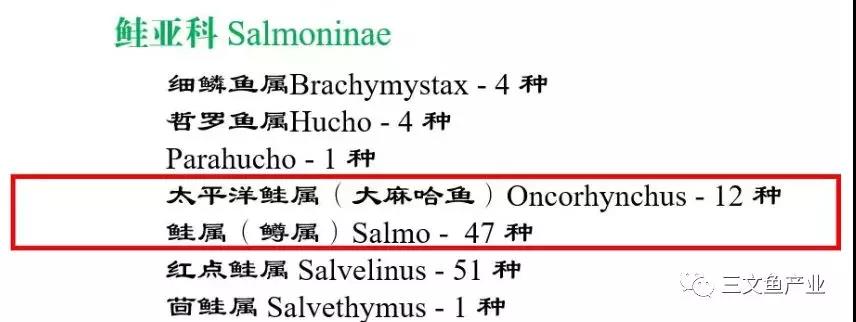 也就是说,鲑salmon与鳟trout所包含的种类大部分重叠在鲑亚科的鲑属Salmo 和太平洋鲑属Oncorhynchus(又称为大麻哈鱼)中。