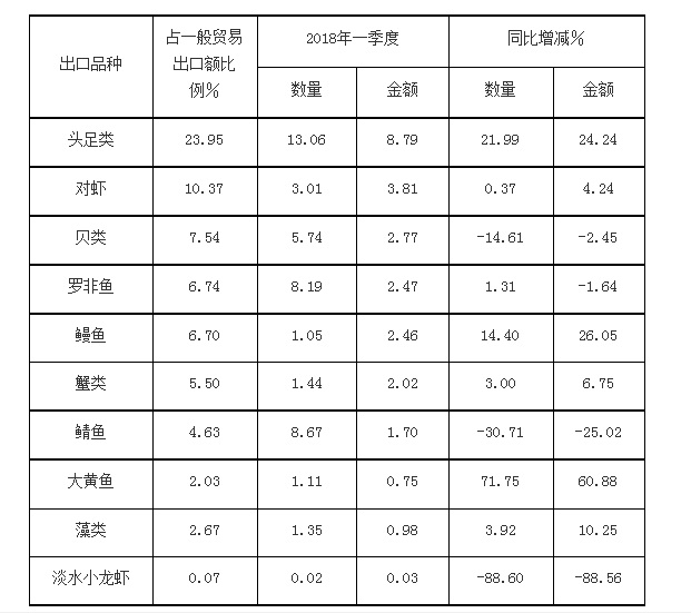 (一)主要品种调结构显成效,一般贸易出口呈量减额增。一般贸易出口量71.18万吨,同比减少4.06%;出口额36.71亿美元,同比增加6.22%,分别占水产品出口量和出口额的72.60%和75.84%,这是继2014年一般贸易占水产品出口总额比重进入平稳期之后的再次提升。其中,头足类、对虾、鳗鱼、蟹类、大黄鱼、藻类等水产品作为一般贸易主要出口品种实现出口量额同比双增。捕捞产品鲭鱼去年同期表现抢眼,一季度受去年高基数影响,出口量额同比分别下30.71%和25.02%,但仍达8.67万吨和1.70亿美元。头足类水产品受出口到葡萄牙及日本的量额大增影响,出口量额同比分别增长21.99%和24.24%。