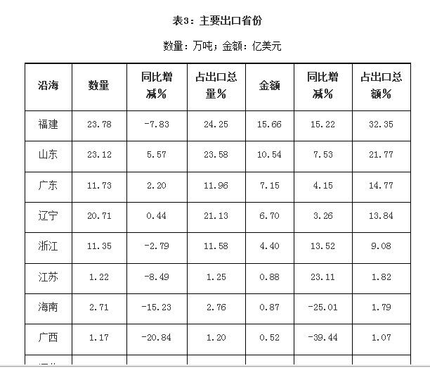 全国第一季度出口量98.04万吨,同比减少2.76%,出口额48.41亿美元,增加5.90%。