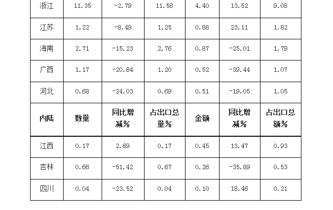 (四)出口区域布局基本稳定。福建、山东、广东、辽宁、浙江、海南等沿海省份仍是我国水产品主要出口区,出口量额之和分别占全国水产品出口总量额的98.04%和97.54%,比重比2017年进一步加大。福建继续位居我国主要省份水产品出口额排名首位,同比增加15.22%。山东省一季度水产品外贸稳增长成效显著,虽然2017年3月当月同期基数较高,但一季度整体量额同比增加5.57%和7.53%。广西受出口鱼类、虾类量额大幅下降的影响,全年出口量额同比分别下降20.84%和39.44%。内陆省份中,江西、吉林和四川位列前三,吉林省受边贸环境影响,全省水产品出口量额同比分别下降51.42%和35.89%;湖北省受小龙虾和冻鮰鱼片出口下滑影响,全省水产品出口量额同比分别下降84.48%和93.21%,已被四川省超越,跌至内陆出口额排名第六位。