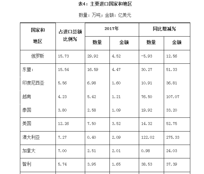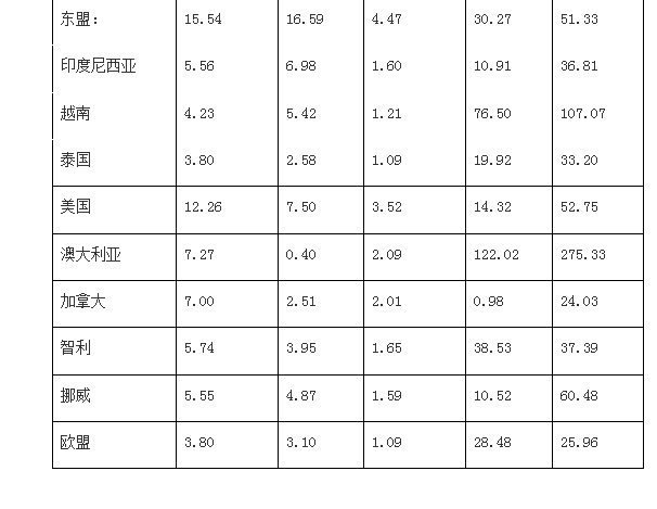 (二)从主要进口市场看,普遍出现量额双增情况。受冻鳕鱼、冻大马哈鱼等进口量大减的影响,我国从俄罗斯进口量同比减少5.93%,但受蟹类和比目鱼进口额增加影响,我国从俄罗斯进口额同比增加12.56%,俄罗斯依然位列我国进口市场第一位。受鲜冷冻鱼、饲料用鱼粉等进口量额激增的影响,我国从东盟进口上扬,进口量额分别上涨30.27%和51.33%;受龙虾进口量额大增的影响,我国从澳大利亚进口量额同比分别上涨122.02%和275.33%。