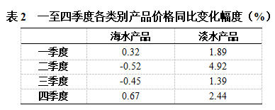 分类别看,海水产品综合平均价格与上年持平,淡水产品价格同比上涨2.66%,呈现淡水产品走强、海水产品偏弱的格局。海水产品价格在一、四季度同比上涨,二、三季度同比下降;淡水产品在一至四季度均同比上涨,且二季度涨幅最高,达到4.92%(表2)。
