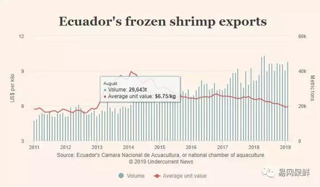 2019年前两个月中,厄瓜多尔白虾全球出口总量同比增长23%,达到85655吨。由于价格低廉,厄瓜多尔的虾类出口激增。据中央通讯社(CNA)报道,今年1月至2月,厄瓜多尔虾类出口的平均单价同比下降10%,至每公斤5.89美元。这是自2013年以来,出口额首次跌破每公斤6.00美元。