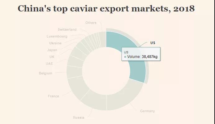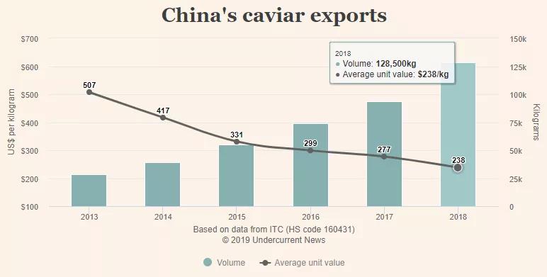 国际贸易中心(ITC)数据显示,中国去年出口鱼子酱129吨,但出口单价比2017年下跌14%,至$238/kg。