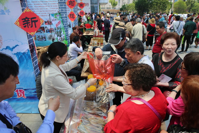 在海安河豚节上,来自上海苏州等地的游客在挑选河豚制品。 采访对象提供