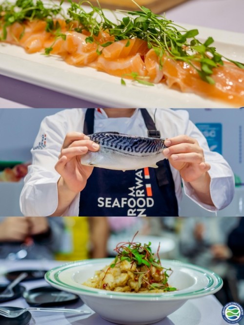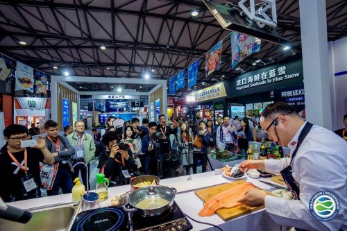 展会第一天,中国水产流通与加工协会携手挪威海产局、ASC认证的可持续水产品企业高光亮相,为大家奉上了高端海鲜品类的饕餮盛宴。从原料的挑选、菜品的设计到餐酒的搭配都经过了严格的筛选,知名大厨现场烹饪,全天活动不仅展示了美食,并重现美食烹饪场景,邀请来自高端酒店餐饮集团、大型连锁商超、生鲜电商的优质买家、专业观众莅临现场品尝洽谈。