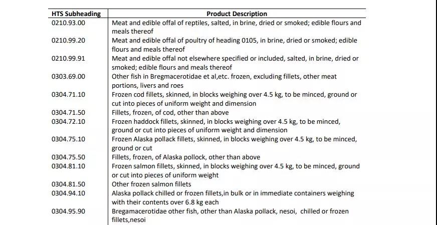 5月17日,美国贸易代表办公室(USTR)公布一份最新的中国进口商品征税清单,涉及价值3,000亿美元的商品,三文鱼、真鳕、狭鳕、黑线鳕等商品在列(下图)。