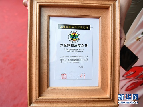 潜江市人民政府市长龚定荣(右)接过潜江龙虾大世界基尼斯记录认证证书。