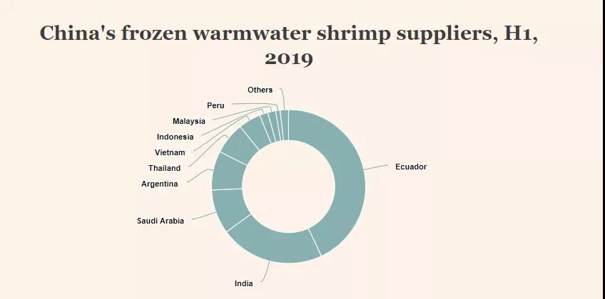 从前六个月的数据上看,厄瓜多尔进口额为6.69亿美元,印度3.41亿美元,沙特阿拉伯1.45亿美元,阿根廷(包括冷水虾、红虾等品种,均在HS code 030617名录下)1.28亿美元。作者/ Louis Harkell
