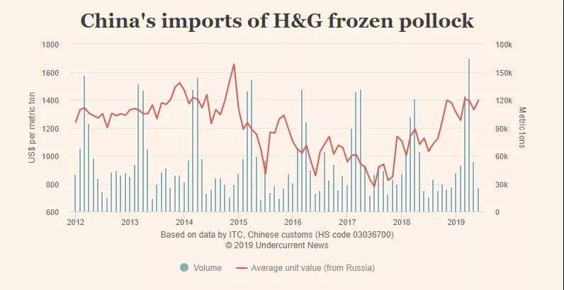 七月份俄罗斯狭鳕原料(H&G)涨到10年最高价,主流产品(非MSC认证,25cm+)的价格涨至$1,700/吨,近期回落至$1,650/吨附近。