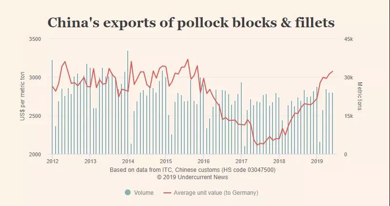 国际贸易中心(ITC)数据显示,今年中国从俄罗斯进口的狭鳕比往年有大幅的增长,四月份的进口数量达到164,618吨,同比增长36%,创下了自2012年以来单月进口之最,均价在$1,392/t,同比增长17%。而中国生产的狭鳕块冻产品的出口额也呈增长趋势(下图)。