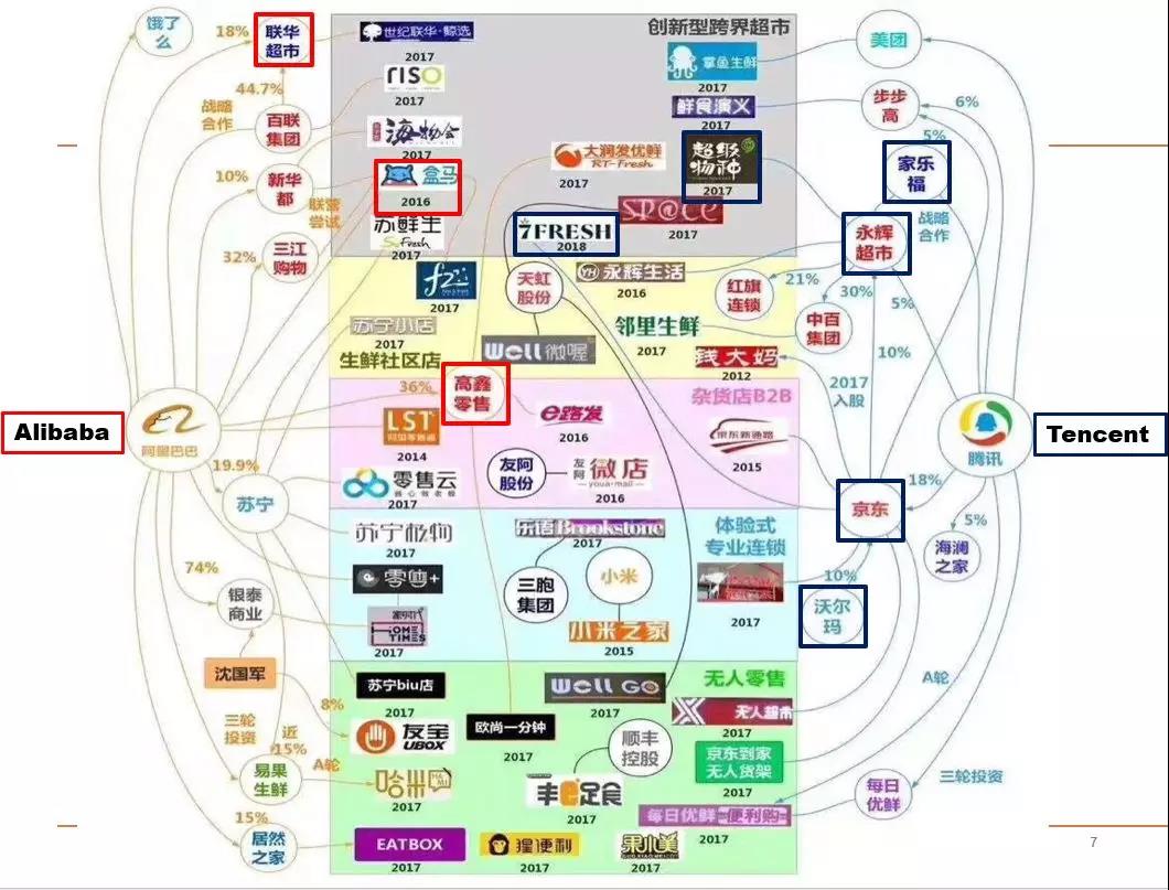 中国零售业的发展,与科技巨头的驱动力存在很大的关联。近些年,阿里巴巴和腾讯收购大批零售实体店,力推线下市场,通过支付宝和微信支付等金融工具赢得市场优势。