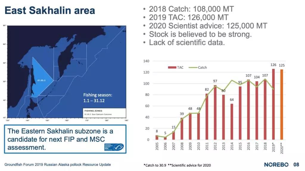 鄂霍次克海狭鳕产量占俄罗斯全国的60%,2019年捕捞限额为96.4万吨,而科学界建议,该海区2020年的配额可增加10万吨,至106.4万吨。